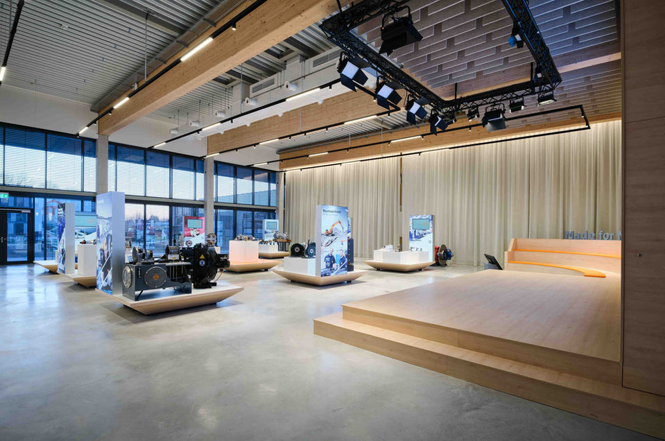 Mit seinem markanten Entree wirkt das Exhibition Center auf dem Werksgelände als Blickfang und integriert sich gleichzeitig in die bestehende, architektonisch hochwertige Gebäudelandschaft. Eine große Ausstellungshalle mit Foyer und angeschlossener Werkstatt ist das Herzstück des Gebäudes. Ein zur Halle geöffneter Besprechungsraum und eine Catering-Küche für Mitarbeitende und Besucher sowie weitere Nebenräume wurden zusätzlich eingerichtet. Für die repräsentative Erschließung der Galerie auf der oberen Gebäudeebene sorgt eine frei in der Ausstellungshalle platzierte Treppe. Diese wurde ebenso wie Teilbereiche der Innenwände mit optisch ansprechenden und akustisch wirksamen Ahornholz- Elementen verkleidet. Zur besseren Raumakustik trägt auch ein sechs Meter hoher Vorhang bei, mit dem Ausstellungshalle und Foyer bei Veranstaltungen getrennt werden können. Weitere Elemente der hochwertigen Raumgestaltung sind der Boden im Sichtbeton-Look und die eleganten Brettschichtholzbinder der Deckenkonstruktion, mit denen die knapp 20 Meter tiefe Halle überspannt wird.