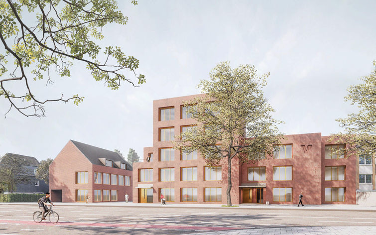 Der Entwurf gliedert die Gruppe der Wohngebäude um einen „Dorfanger“ im Zentrum des Grundstücks. Die windmühlenartige Anordnung der Gebäude sorgt in der hohen baulichen Dichte für eine sehr gute Belichtung und Belüftung der Wohnungen. Den Auftakt des Ensembles bildet ein stadtraumprägender, abgestaffelter fünfgeschossiger Kopfbau mit begrünten Flachdächern. Dessen Höhe bezieht sich auf den Hochpunkt einer benachbarten Siedlung aus den 1920er-Jahren und schafft mit seiner moderaten Fernwirkung eine angemessene Adressbildung – insbesondere auch für die straßenseitig vorgesehene Niederlassung der Volksbank Rhein-Ruhr.